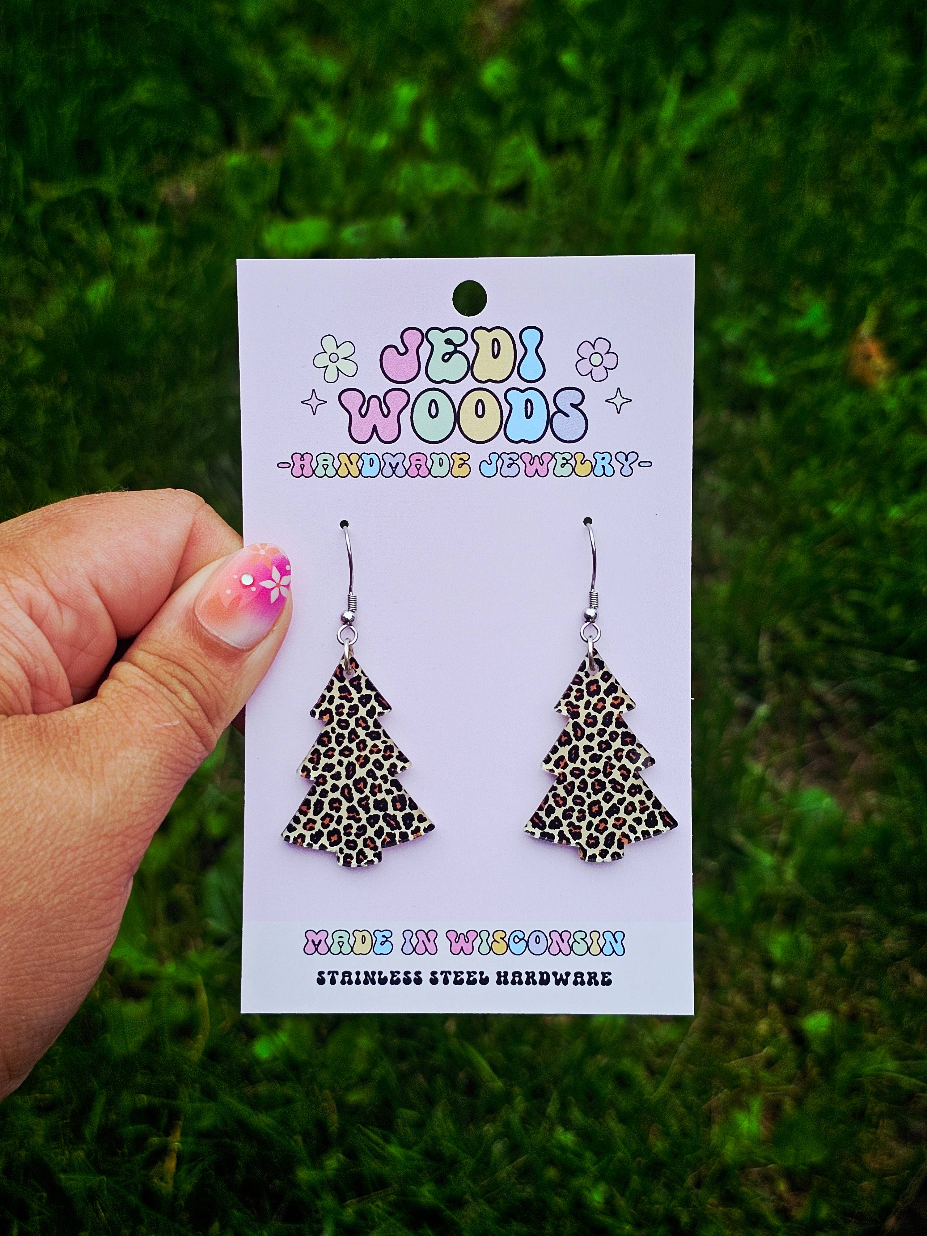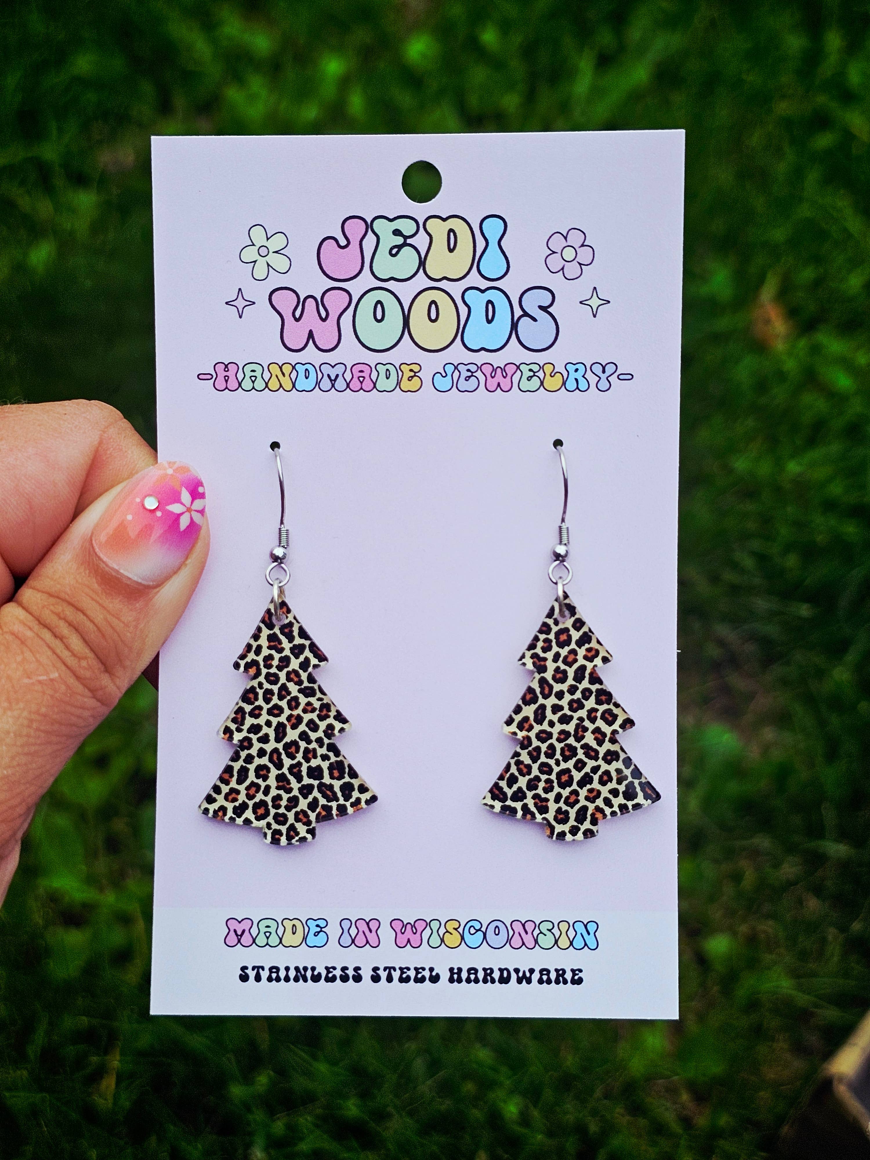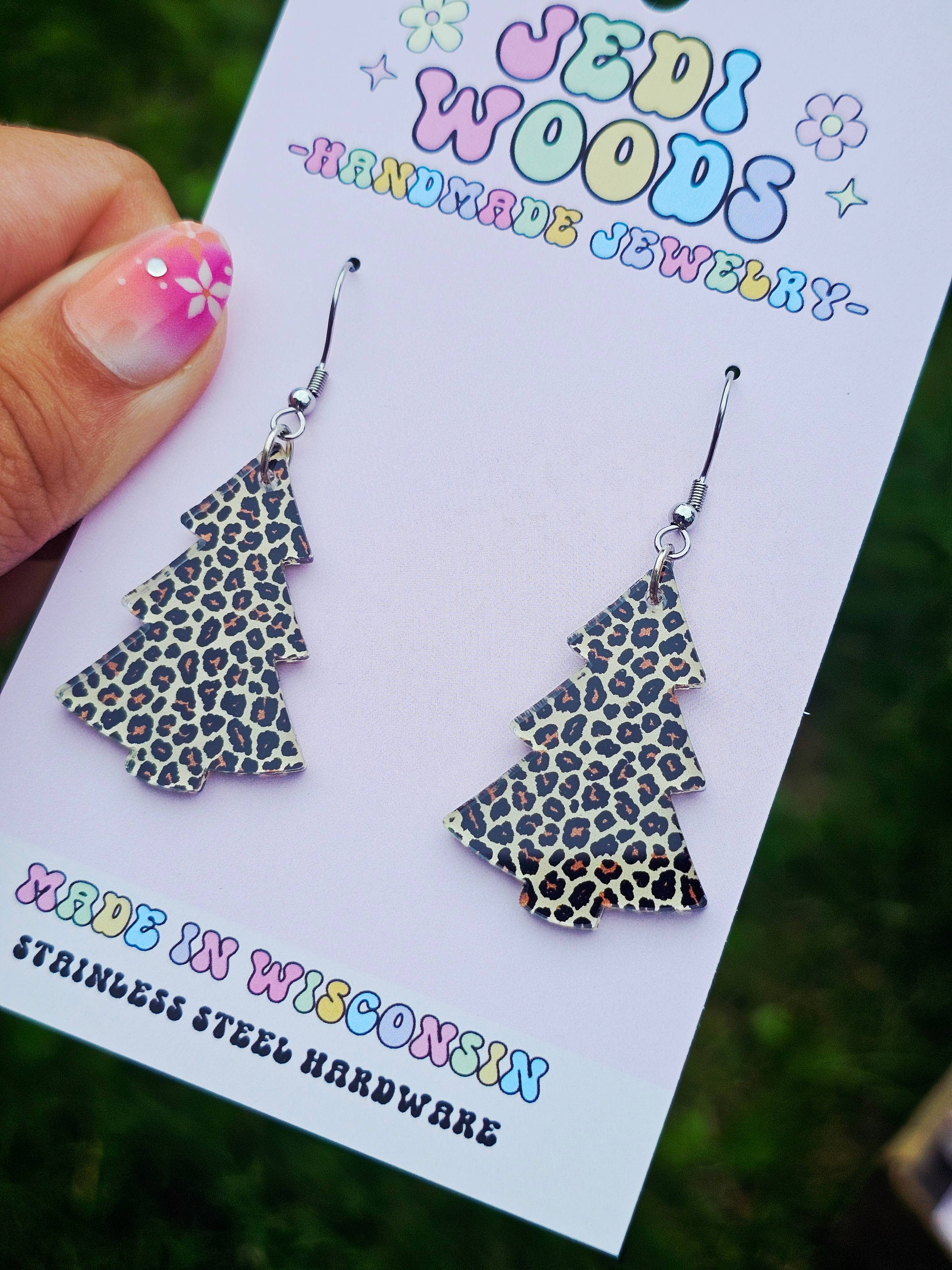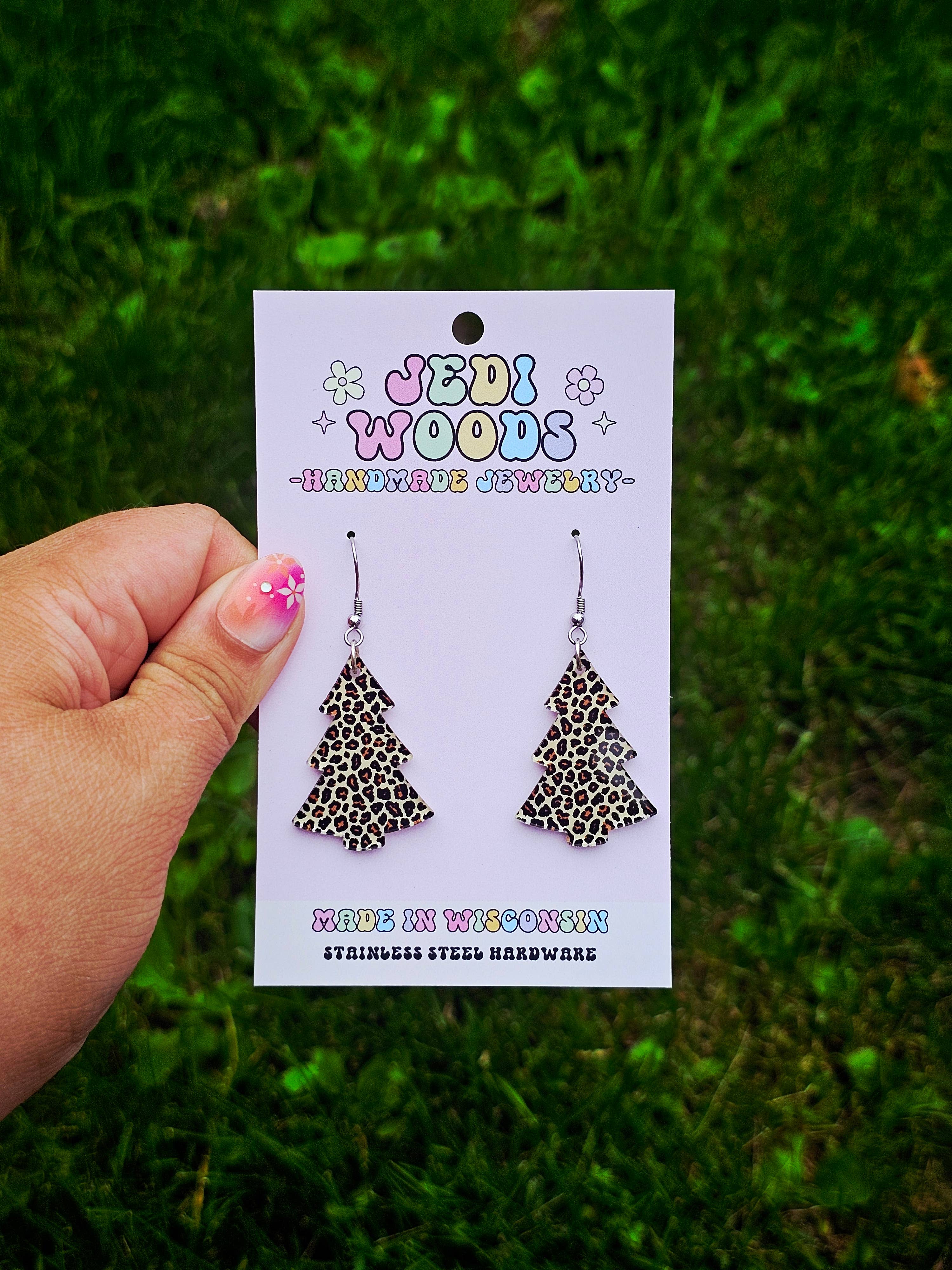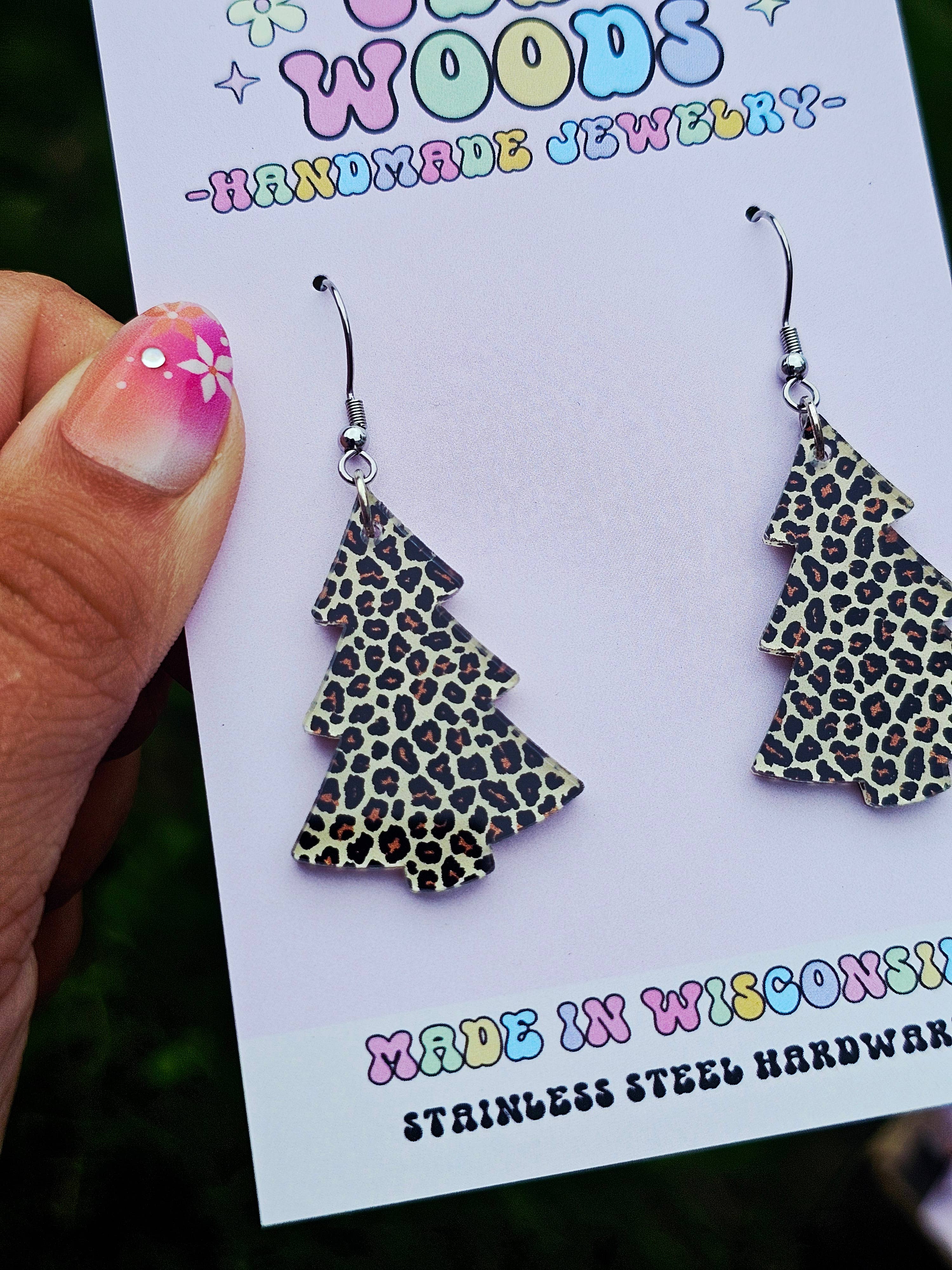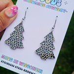 Leopard Print trees designed on laser cut clear acrylic. Trees measure approx. 1.2 inches. (2-inch total drop length)
