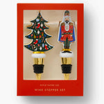 A pretty pair of porcelain wine stoppers, in the shape of a nutcracker and a Christmas tree with illustrated artwork and gold foil accents.