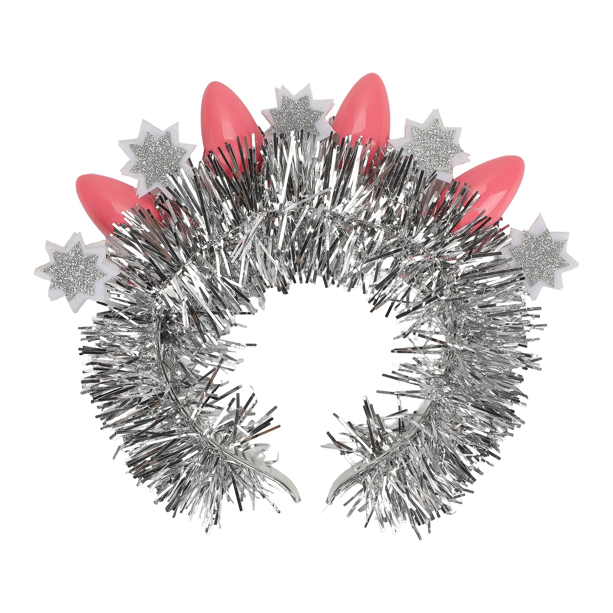 • Silver tinsel headband complete with pink christmas lights and silver glitter coated stars