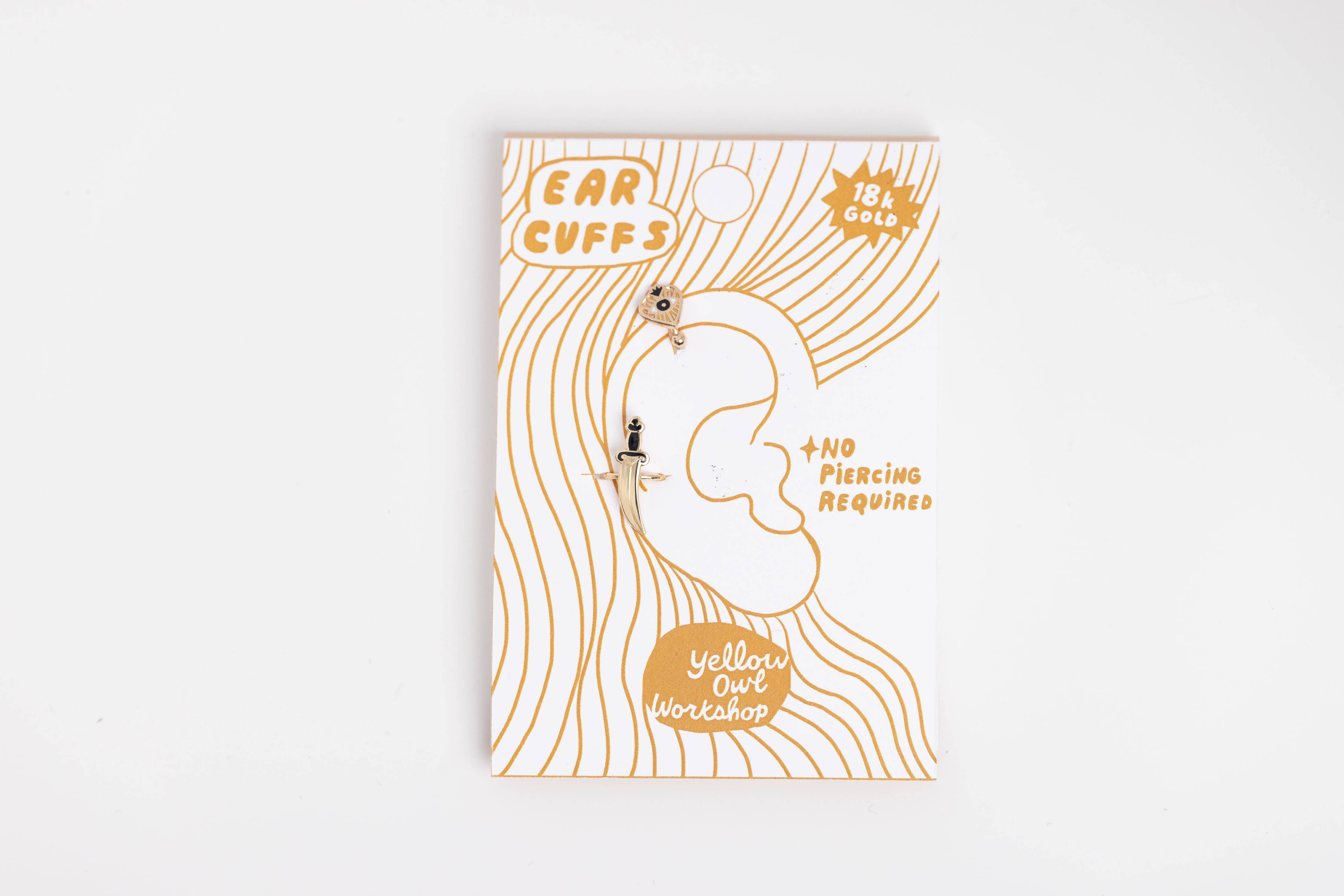 These Ear Cuffs require no piercing! Each golden cuff earring slides comfortably into place wherever you prefer with no healing time needed. This Heart & Dagger pairing features symbols of alchemy and mysticism and brings to mind traditional tattoo aesthetics.