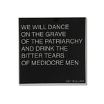 This sticker reads: 'DANCE ON THE GRAVE OF THE PATRIARCHY AND DRINK THE BITTER TEARS OF MEDIOCRE MEN' Put it on your bike, backpack, laptop, car or board.