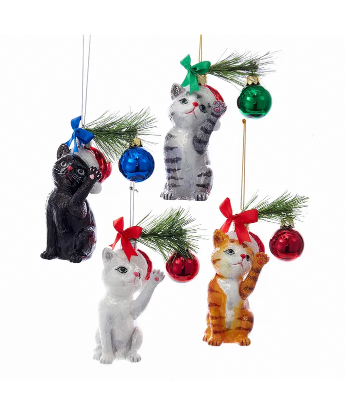 These Noble Gems™ glass Christmas cat ornaments are the purrfect addition to your holiday and home décor! This assortment includes cats in the colors of black, white, brown, and grey. Each of the cats are reaching towards the ornament on the branch of the tree, which are attached to the single ornament.
