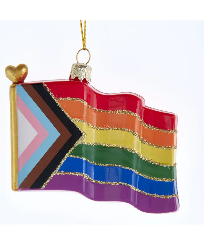 This Noble Gems™ Progress Pride Flag ornament from Kurt Adler is an all-inclusive addition to your holiday décor or Christmas tree. This ornament features the LGBTQ six color stripes, on the left side of the ornament it features a horizontal-pointing arrow of five half-sized stripes. The light blue, light pink and white half stripes represent trans and non-binary people, and the brown and black half stripes recognizes marginalized People Of Color (POC)