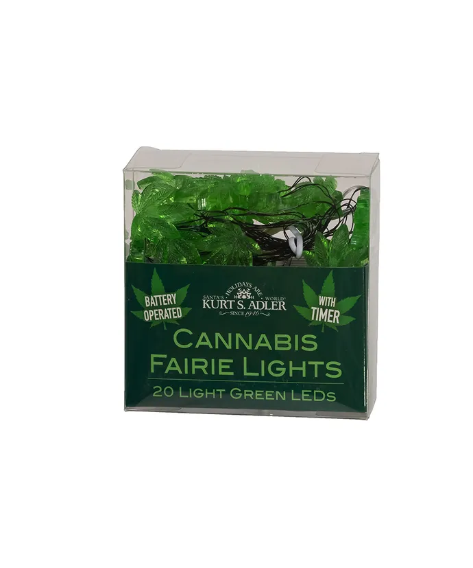 These Kurt Adler batter-operated Cannabis fairy string light sets are a fun addition to your holiday or everyday décor. This light set includes 20 translucent cannabis leaves, each with a green LED light bulb.