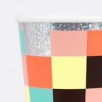 Pixelation perfection! Level up your games party with these paper cups featuring a retro checkerboard design and a sparkly silver holographic foil border. Both practical and decorative, they're perfect for adding a hi-tech look to your table. Ideal for serving hot or cold drinks to kids, teens and adults alike!