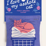 True cat lovers will tell you the truth. One of the best things about cats is how asshole-y they are. Promotes healthy play and exercise. 100% cotton pouch, screen printed and stuffed with premium organic catnip grown in the USA.3.25"h x 3.25"w