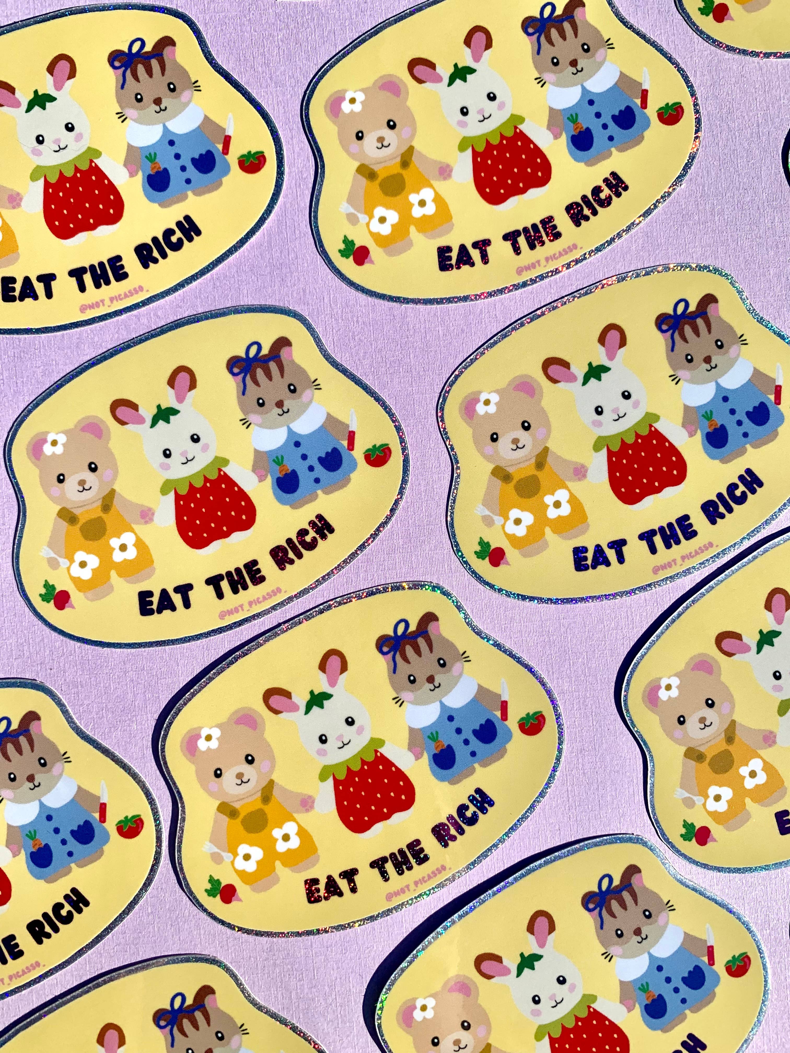 Feeling hungry? This glitter sticker features a great message and cute characters! Measuring at 3 x 2.2 this vinyl sticker is waterproof and weatherproof making it great for phone cases, water bottles, laptops, and more!