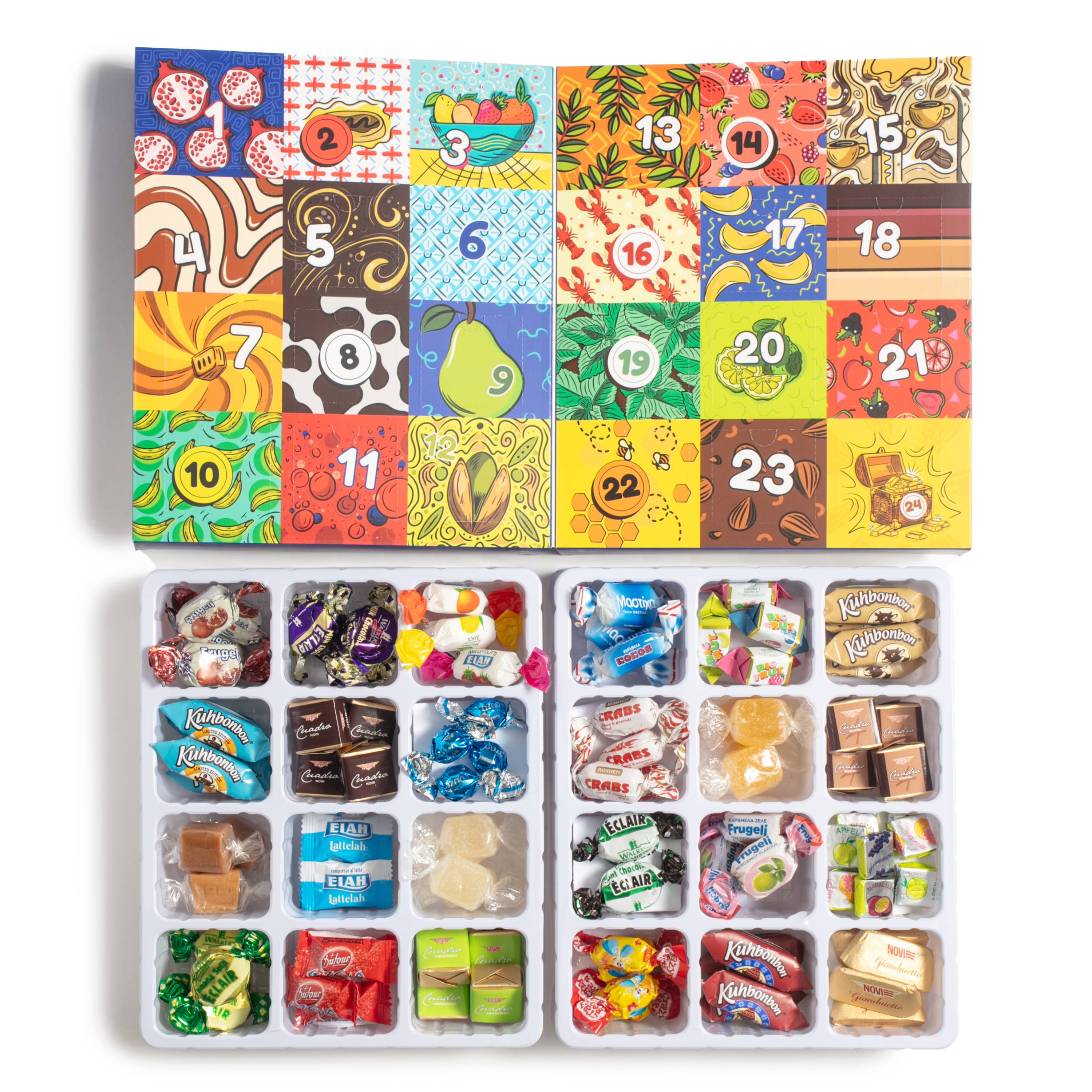 An advent calendar experience unlike any other! Embark on a global flavor expedition this holiday, featuring 24 different candies from all over the world. Each day brings a new adventure, from mastic toffee to quadruple-layered chocolate treats. Made for sharing: each compartment features at least 4 candies.