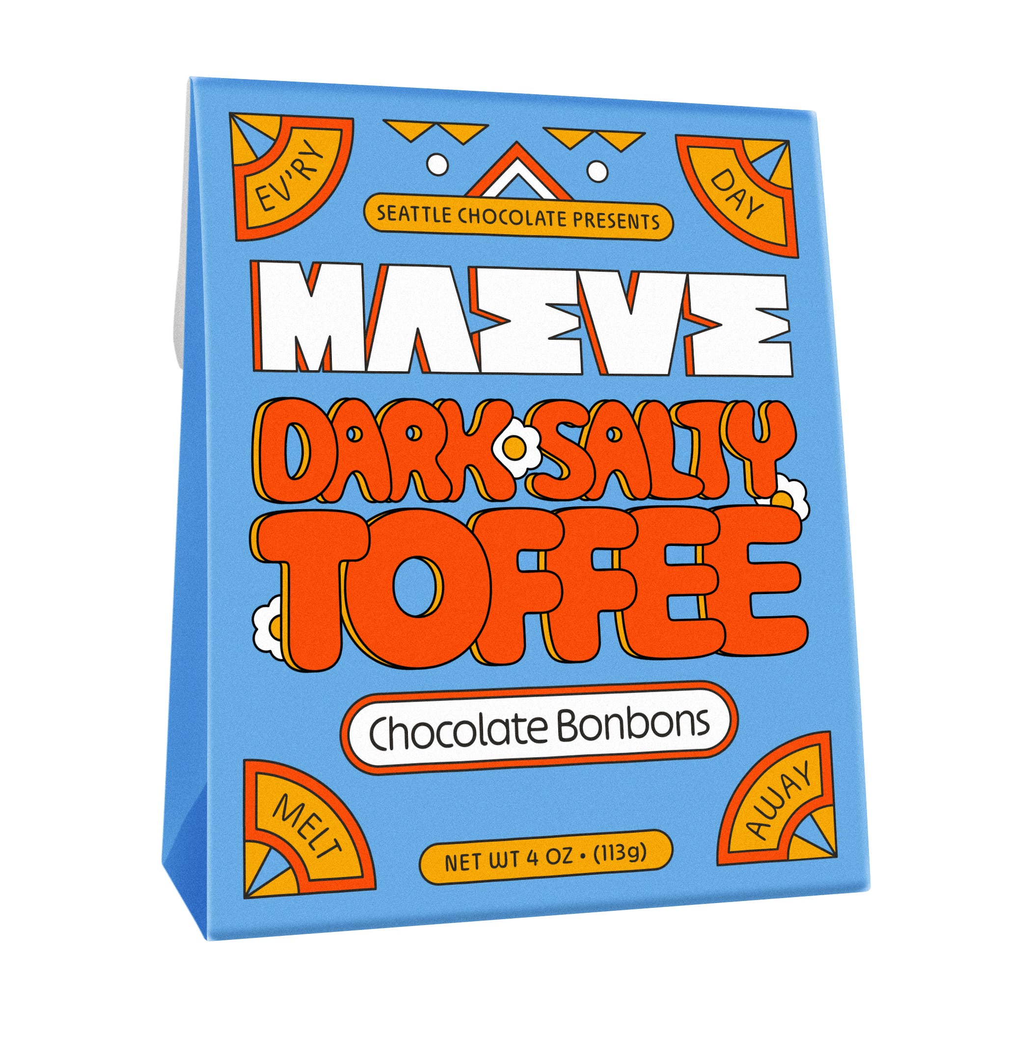 Untwist, we insist! Individually wrapped bonbons in colorful, compostable twist foils. Flavor: Dark chocolate with toffee and touch of sea salt.