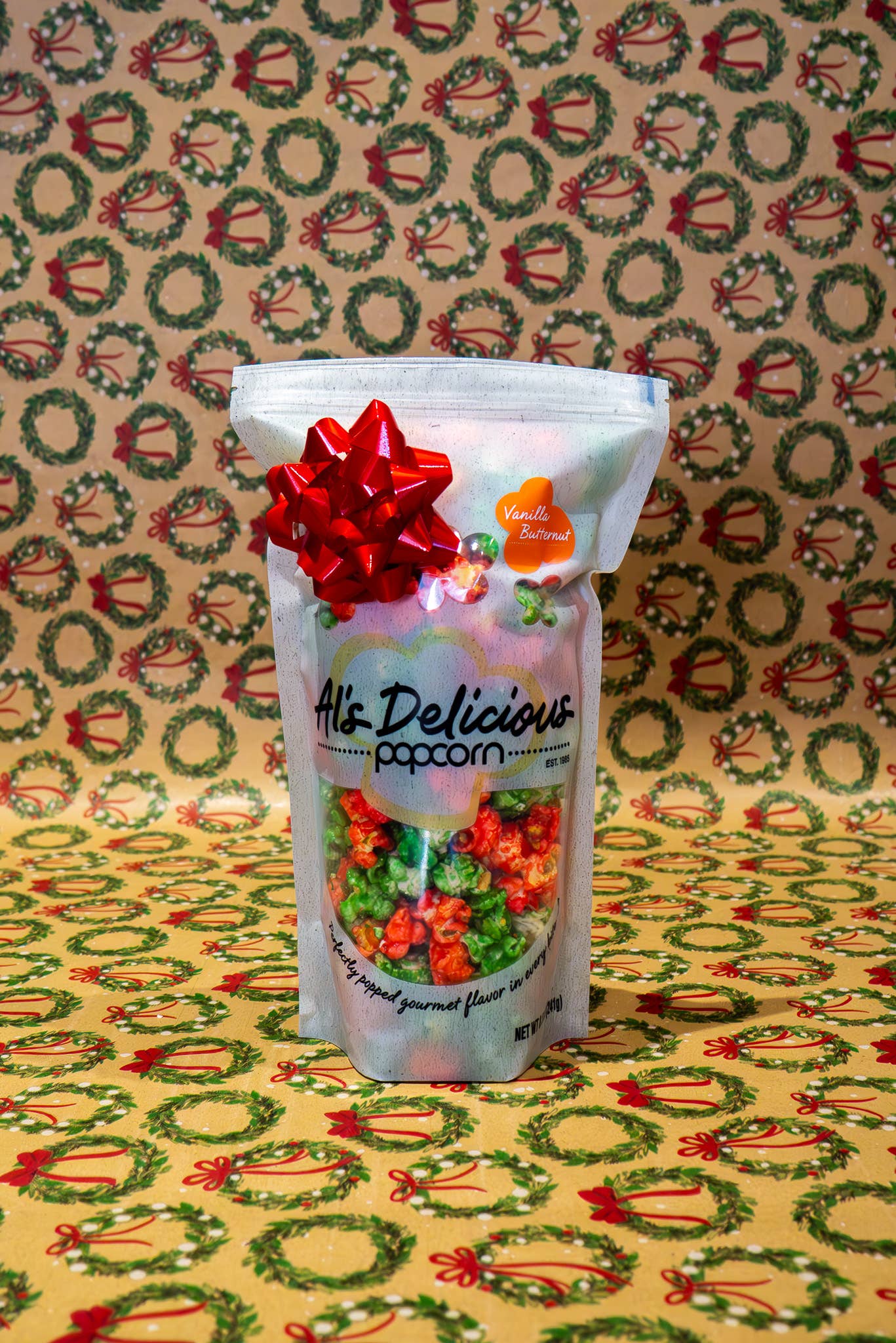 Our Holiday Version of our BEST Seller! When many people think of Al’s Delicious Popcorn, they think of Vanilla Butternut Popcorn! We sell more Vanilla Butternut than any other flavor we make. We call it our ‘elevated Kettle Corn’. It’s sweet, but with a creamy flavor that leaves you wanting more and more and more! Resealable Bag Approximately 7 cups of popcorn Shelf life of 125 days Vegan, Gluten Free, Dairy Free