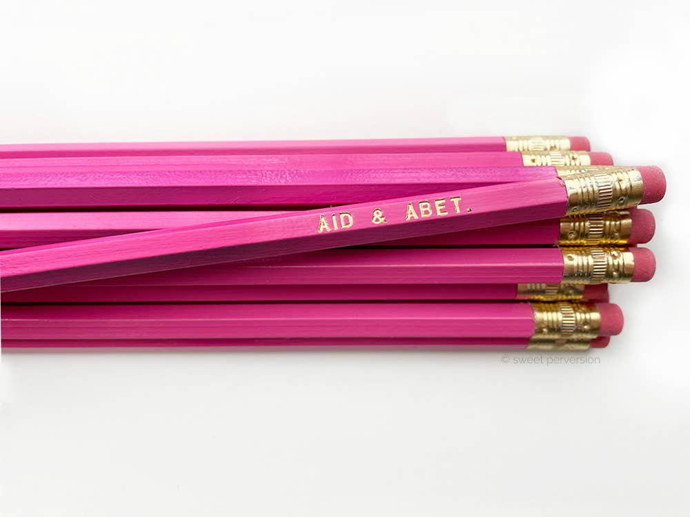 Bright pink with gold text • Made in the USA • Wood pencils with #2 lead • Certified non-toxic • Latex-free synthetic erasers • Unsharpened