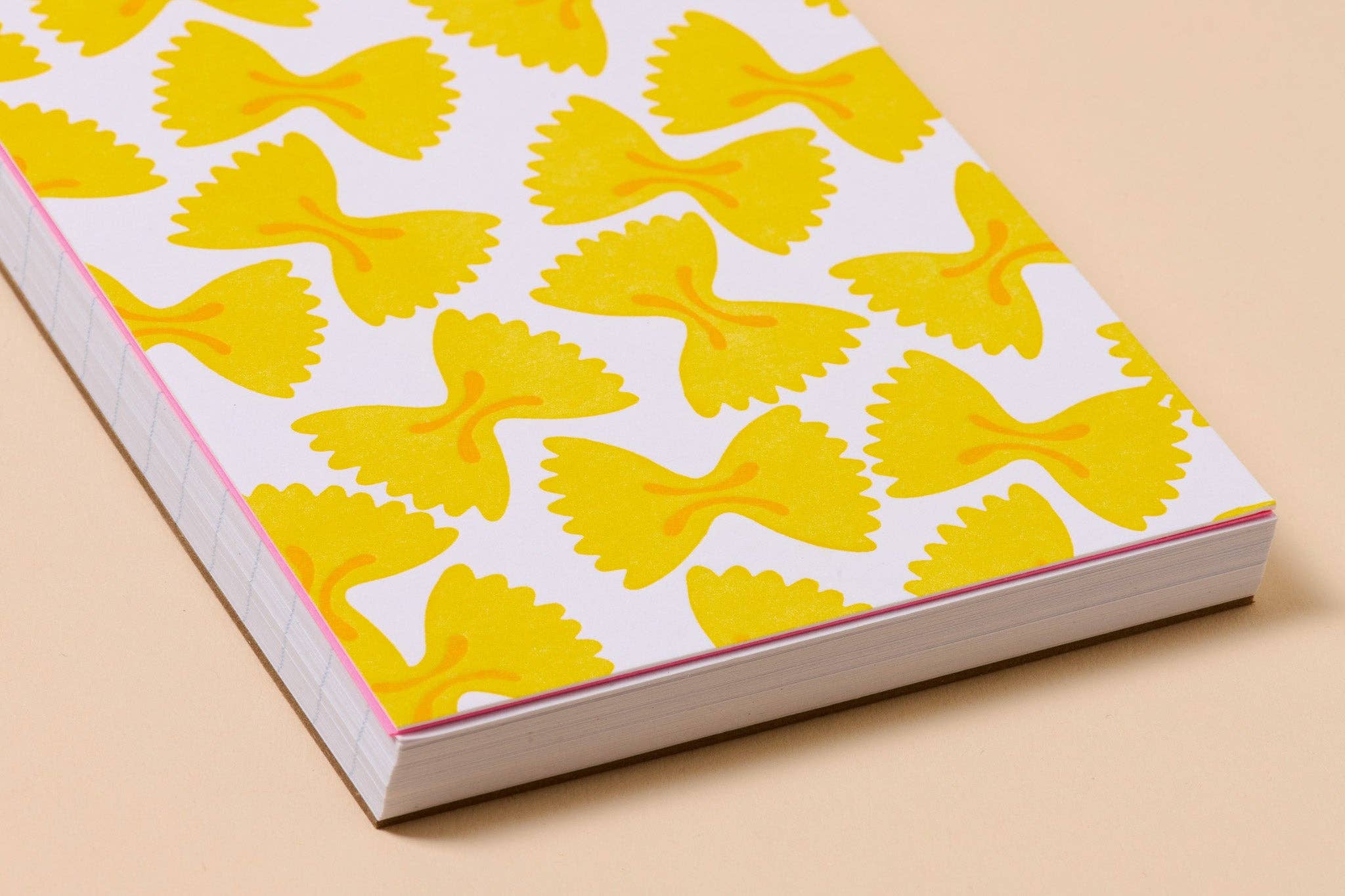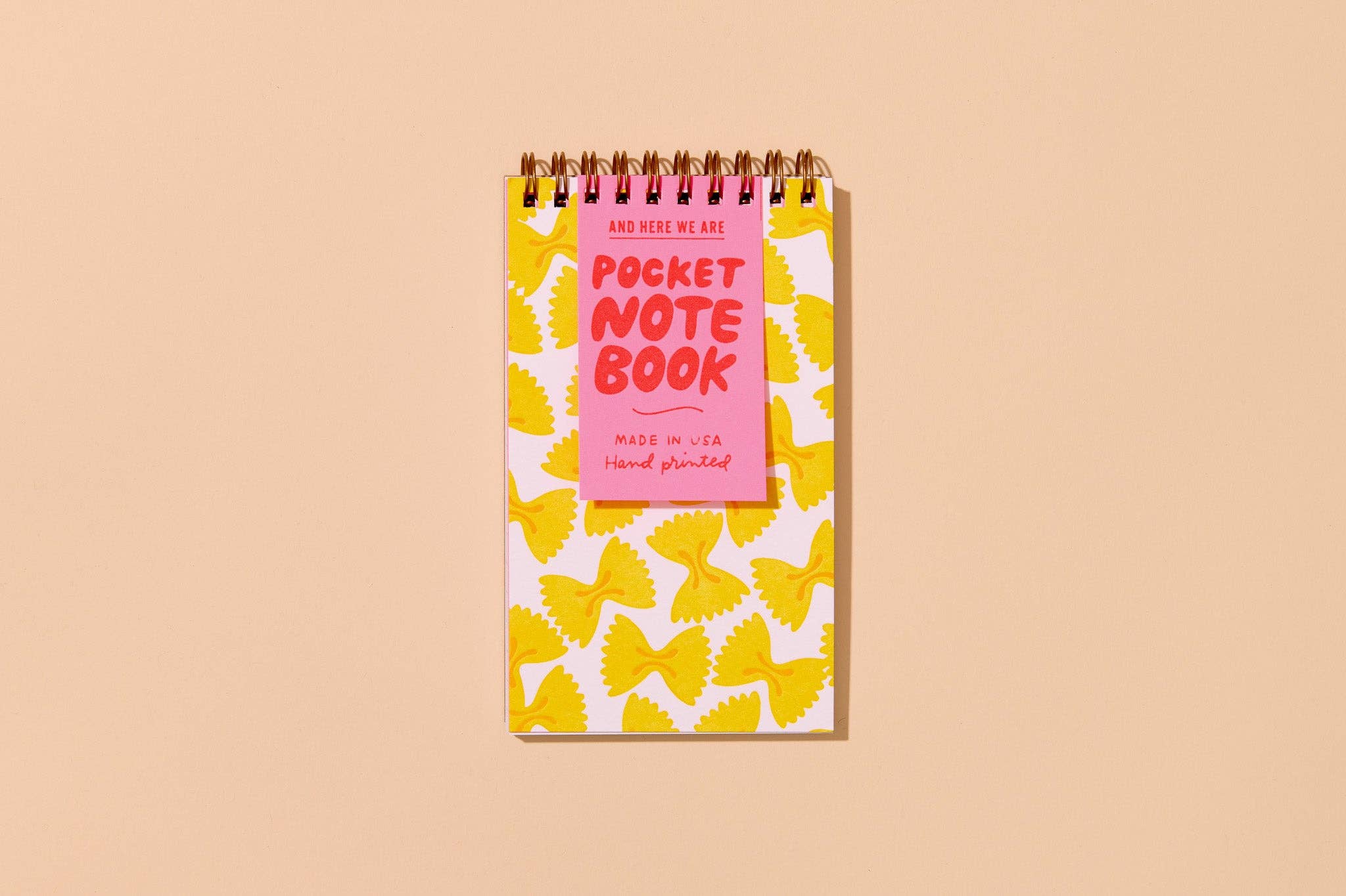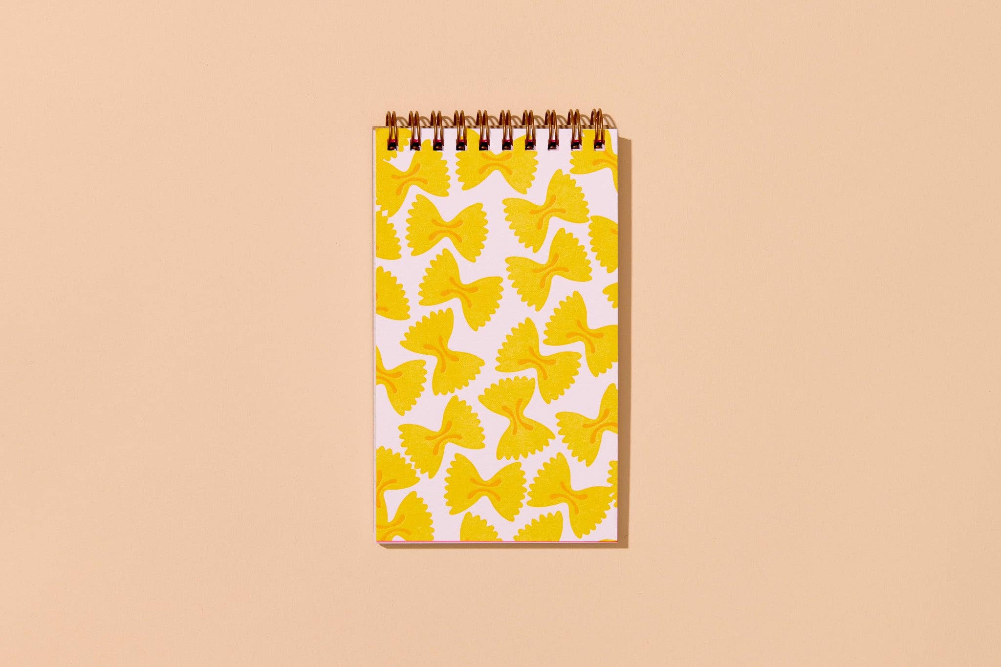 Call it farfalle or bowtie, this handy little pocket-sized notebook is decorated with everyone's favorite pasta. This pocket-sized spiral notebook fits in your pocket or purse, perfect to hold your notes, lists, plans, dreams, ideas, recipes, spells, sketches, doodles, and secrets.