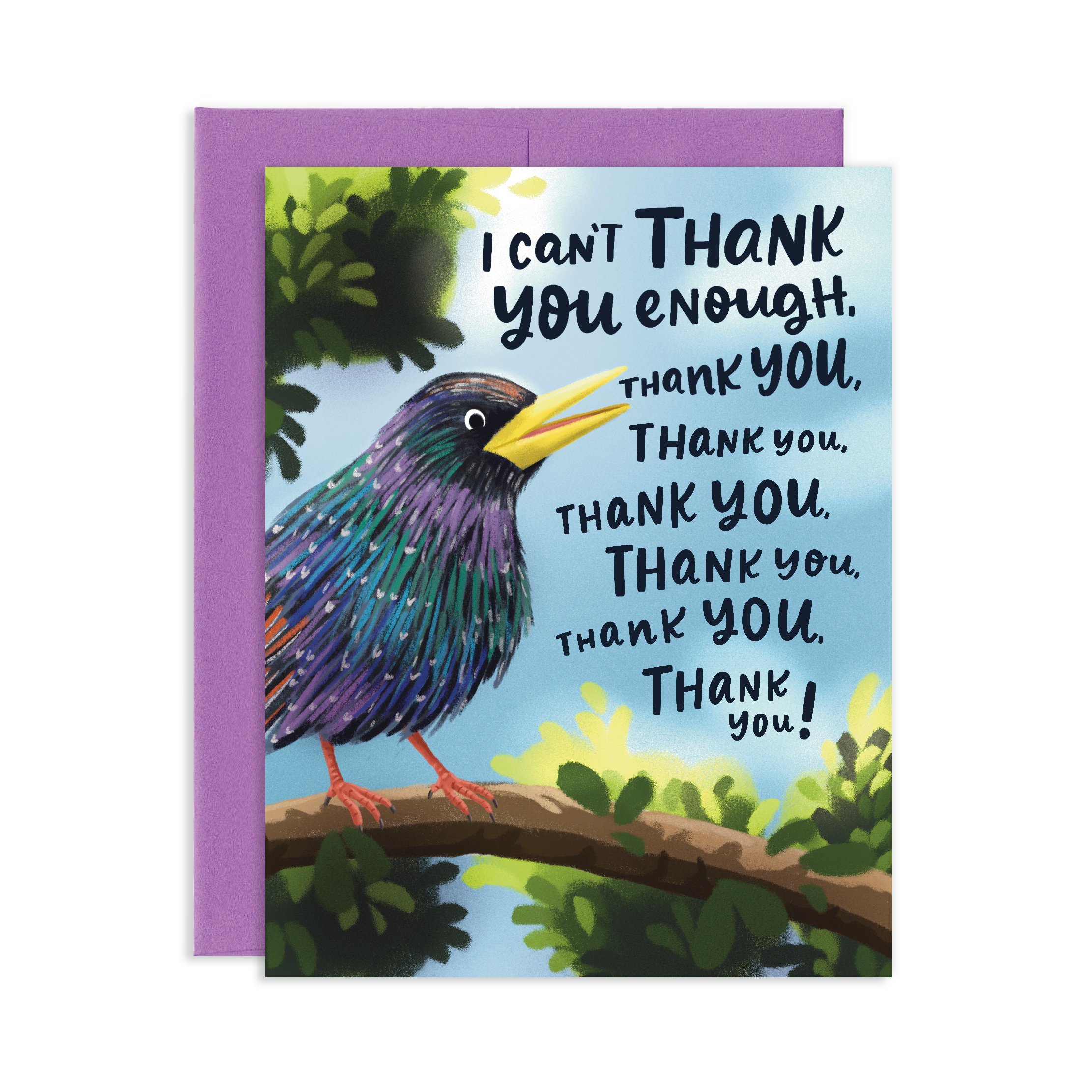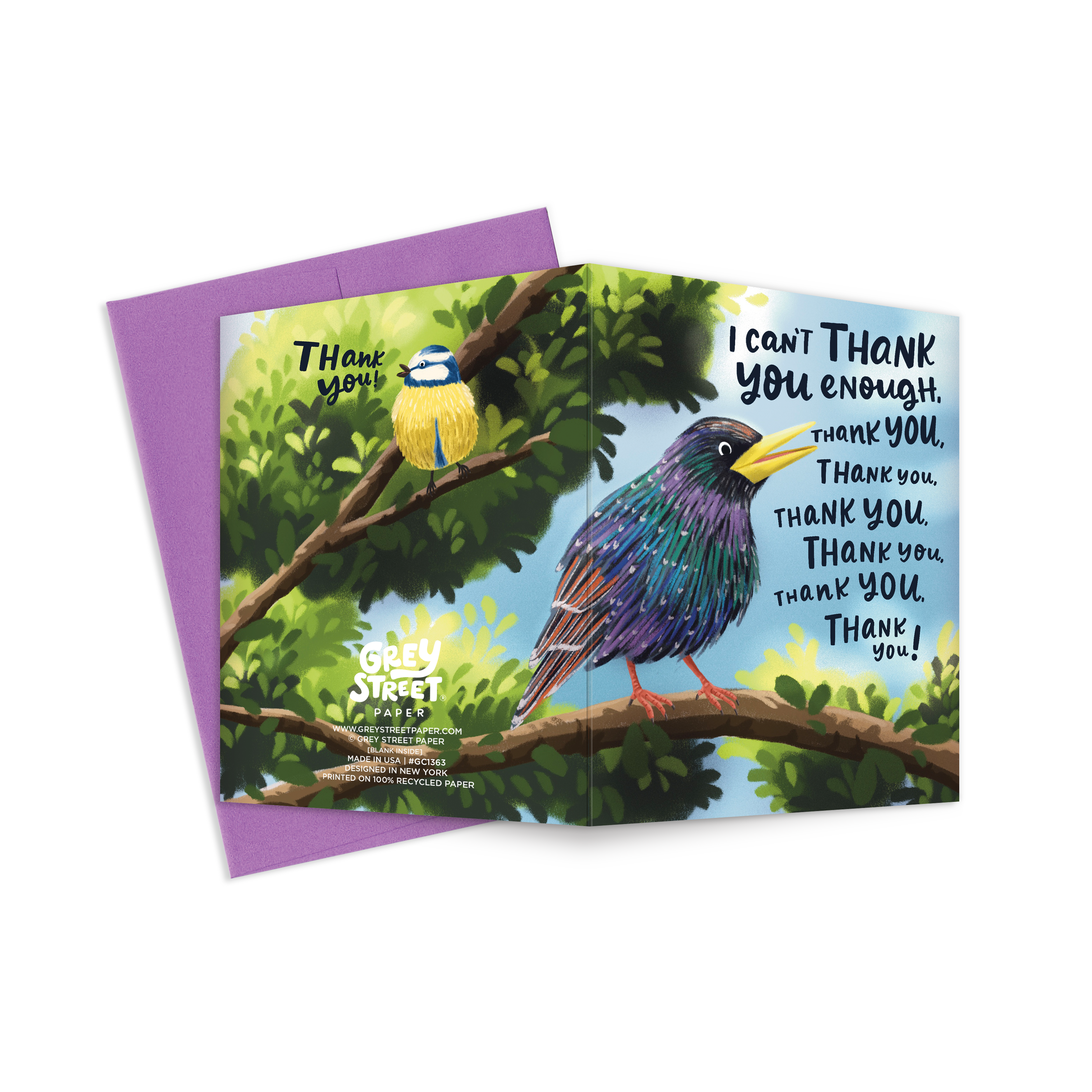 Spread your wings and send a chirpy thank you with our Bird Chirp greeting card! 🐦 Perfect for showing your appreciation with loads of thank yous! 💌 Go ahead and bring a cheerful chirp to your recipient's day! • Blank inside. • Premium 100% recycled paper. • 4.25"x 5.5" fold-over card (Size A2). • Paired with a coordinating envelope. • Packaged in a protective cellophane sleeve. • Professionally printed in the United States. • Made in the USA.