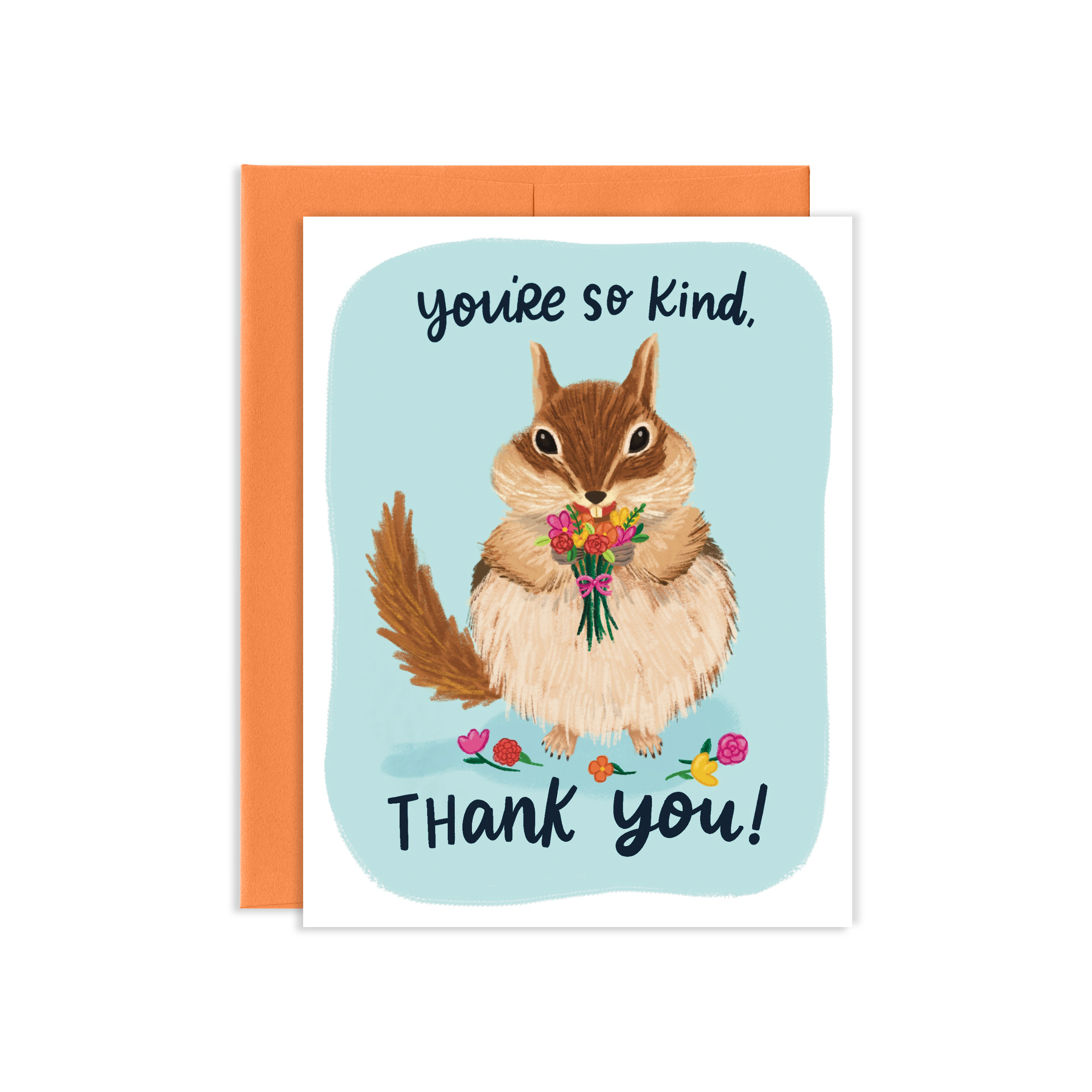 This chipmunk you're so kind thank you card is the sweetest way to show your gratitude to someone special! It's the perfect choice for expressing your appreciation to a friend, family member, or coworker. Let them know how much you appreciate them with this sweet and heartfelt greeting card. • Blank inside. • Premium 100% recycled paper. • 4.25"x 5.5" fold-over card (Size A2). • Paired with a coordinating envelope. • Packaged in a protective cellophane sleeve. • Professionally printed in the United States. • Made in the USA.