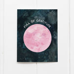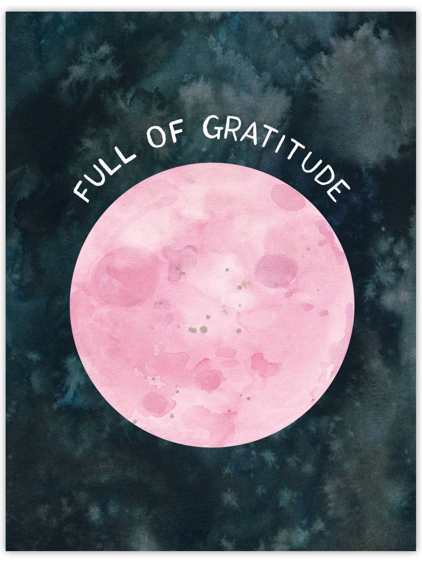 The full moon thank you card features a watercolor illustration of a pink full moon, with the message, Full of gratitude. This card is perfect to express your gratitude to anyone who loves the moon, whether through astronomy or astrology.