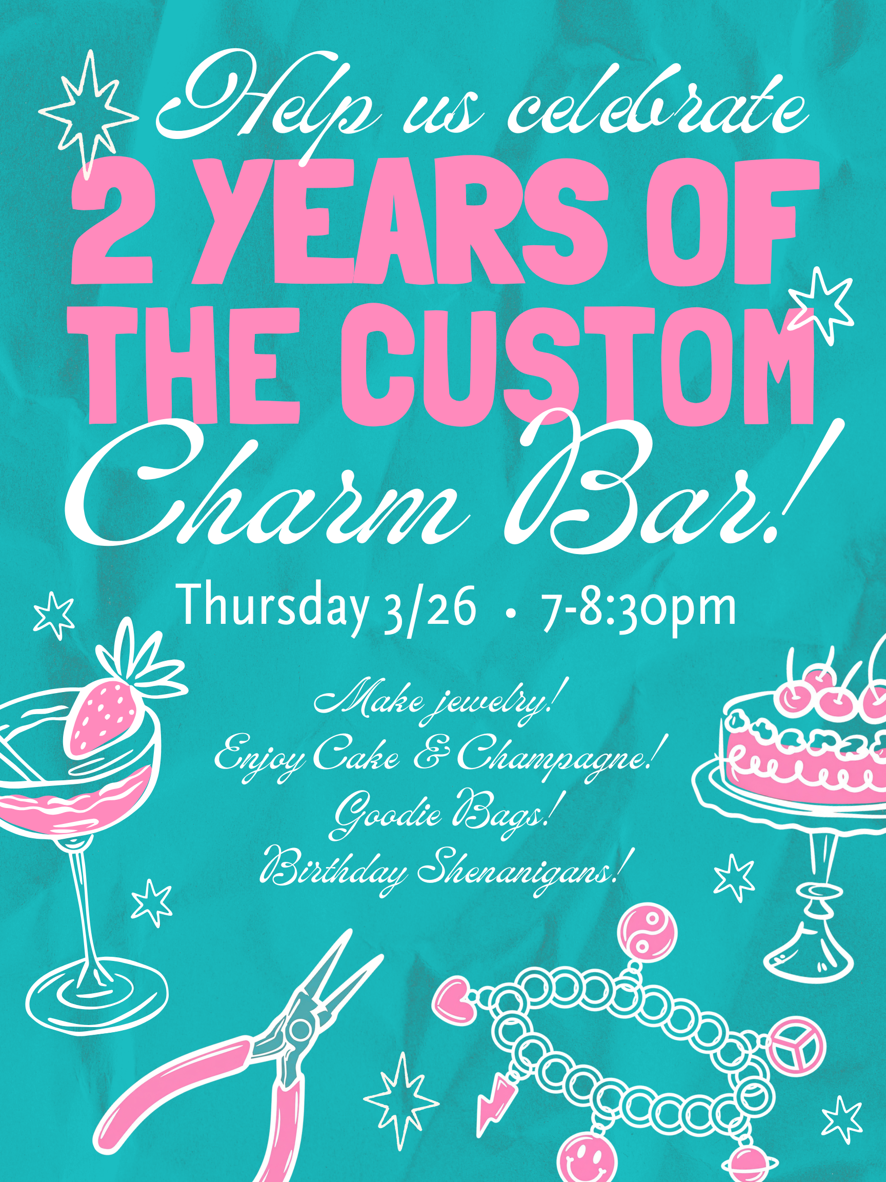 Come celebrate 2 years of our custom charm jewelry bar with us! Make jewelry! Enjoy Cake & Champagne! Get favor Bags! Engage in Birthday Shenanigans!