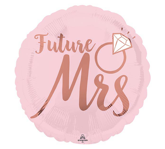 17" round foil balloon with a 2 sided design. One side is blush pink with a ring and message in rose gold " Future Mrs" with the other side's message reading "She said Yes!"