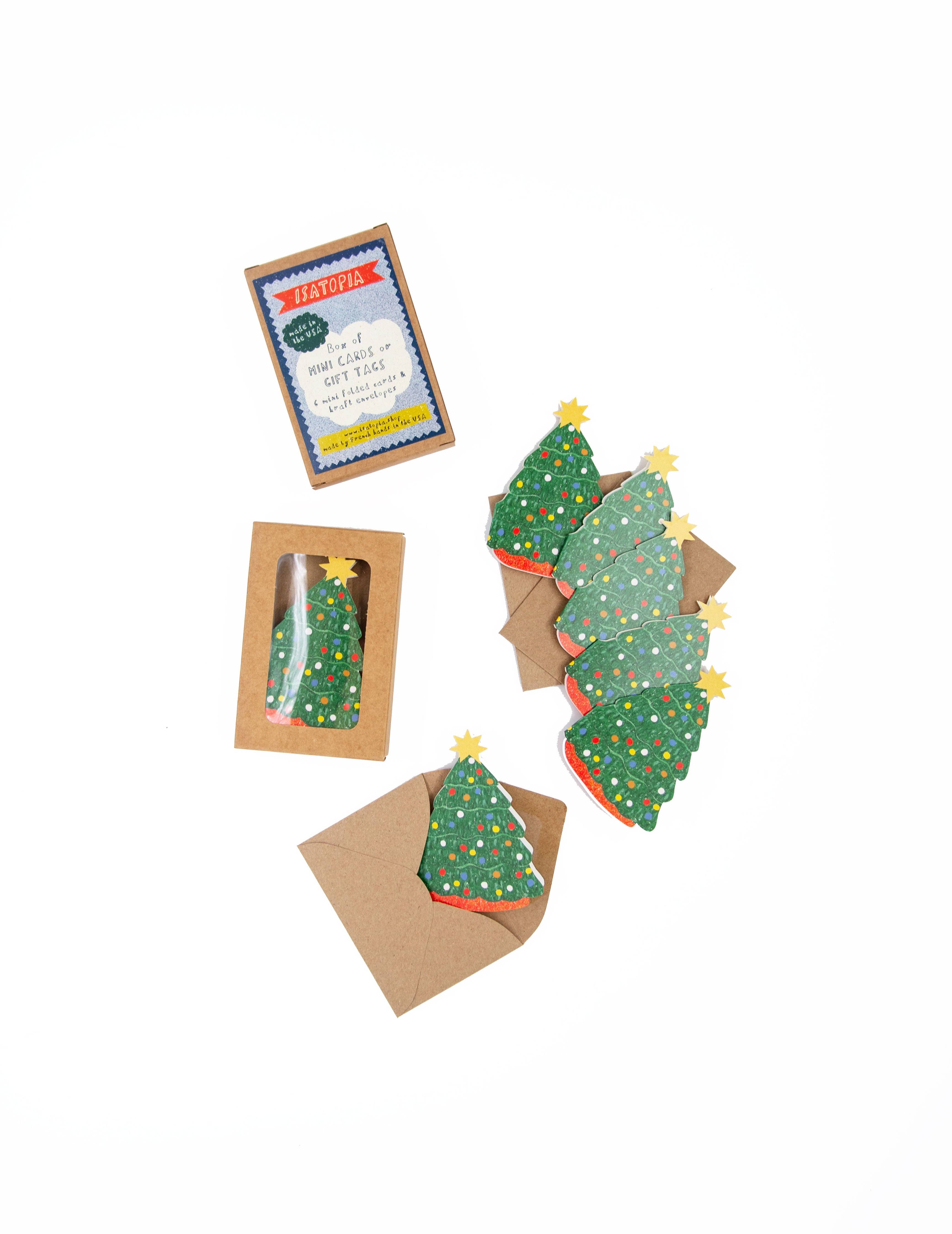 Christmas Tree mini cards! A set of 6 sweet little cards to use as quick notes, or gift labels. Each box has 6 mini folded cards and matching kraft envelopes. 3.5"x2.5" folded card, printed in the USA on sustainably produced #120 coated card stock. Each folded card is blank inside, comes with a brown kraft recycled envelope and is wrapped in a kraft box. Original illustration by Isabelle. Made by French hands in the USA