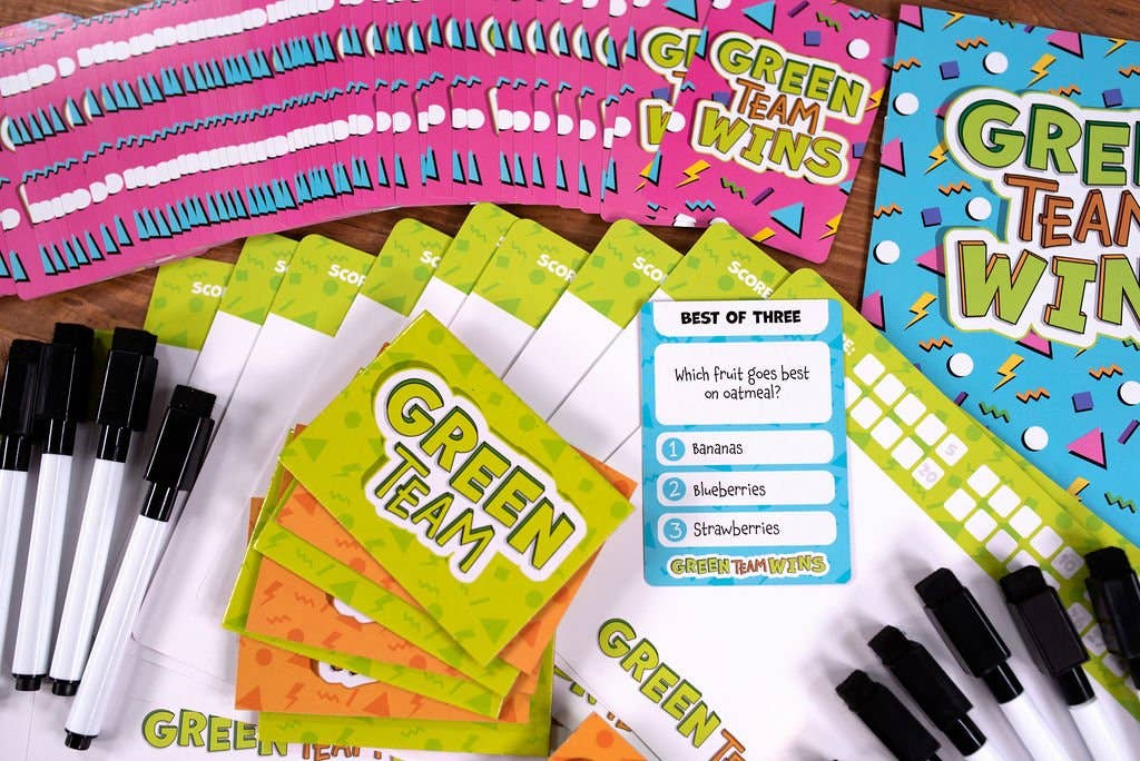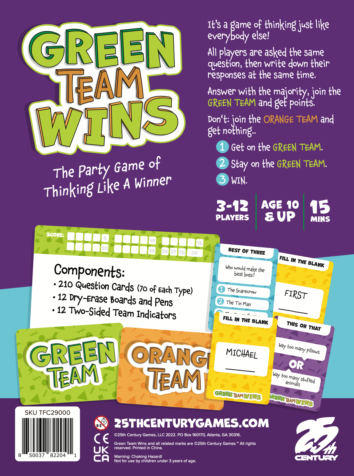 Everyone will be asked the same question, then writes down their responses at the same time. All players with the winning answer join the Green Team and score points.