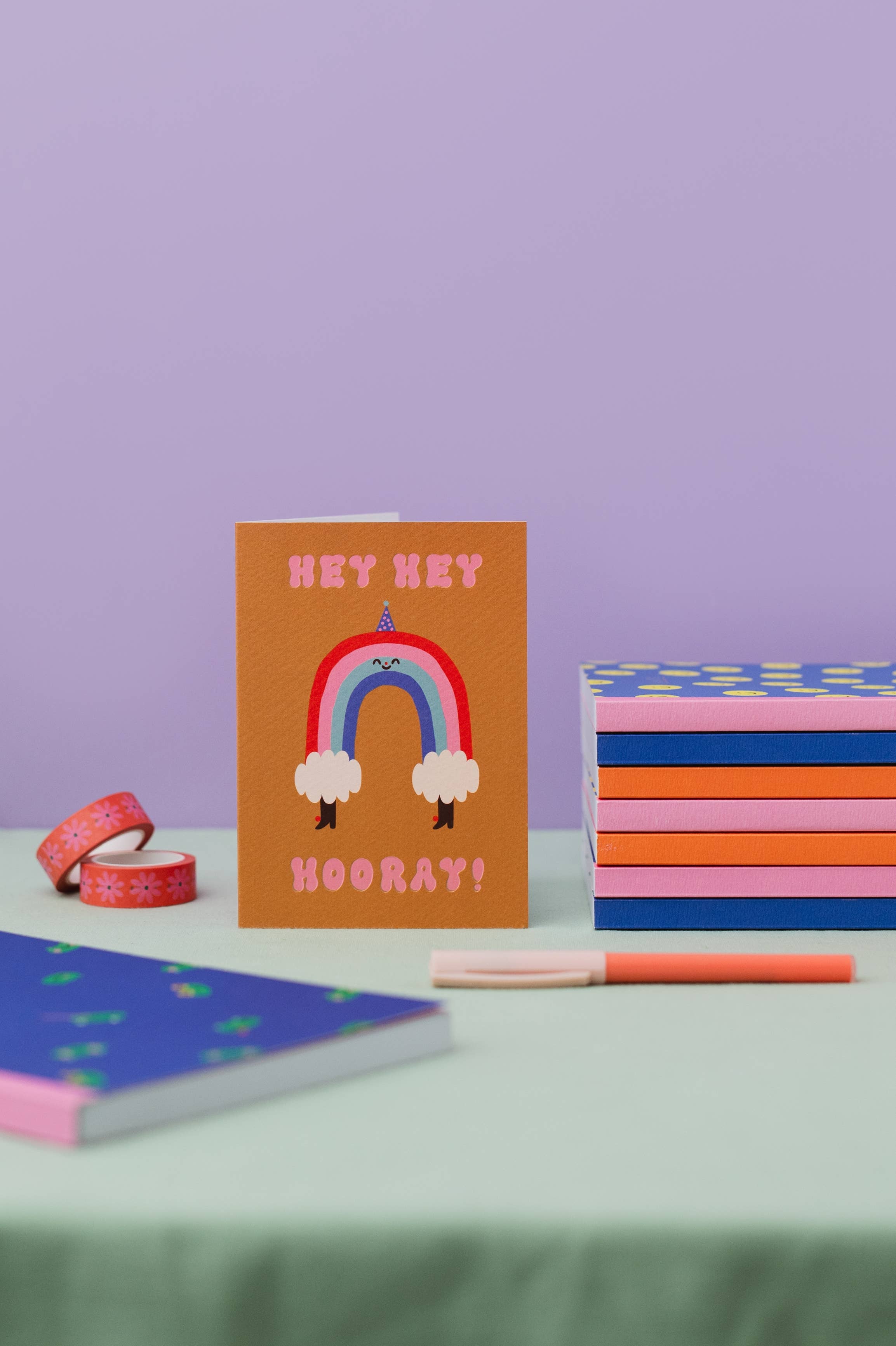 Bring on the cheer with this 'Hey Hey Hooray' greeting card, created in a fun collaboration between Rumble Cards and Wera Krason. This card features a joyful rainbow smiling under a party hat, making it perfect for any celebration or just to spread a little happiness.