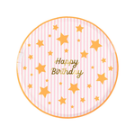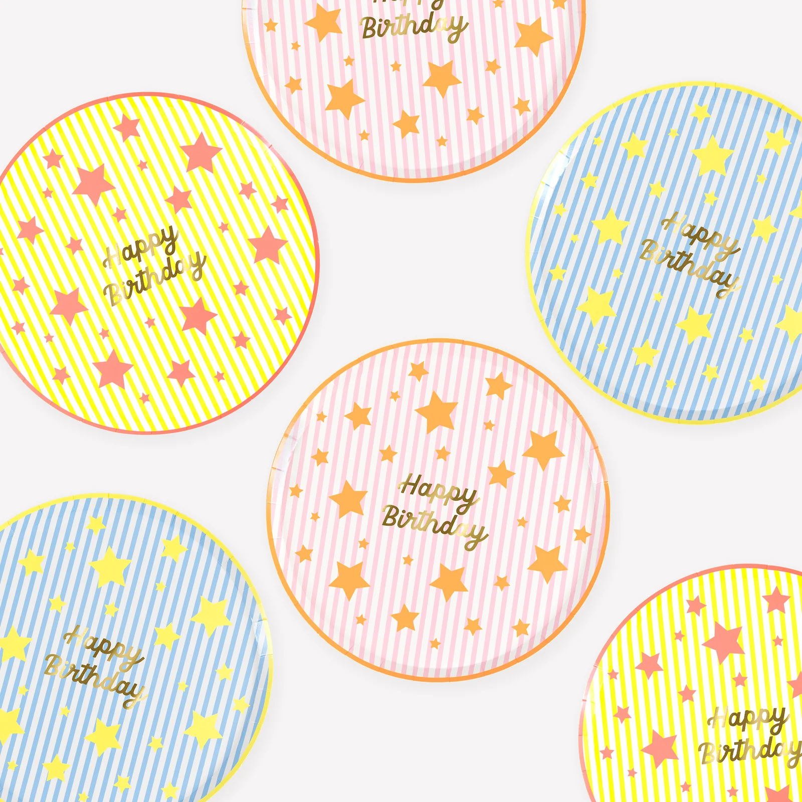 Celebrate a birthday star in style with these wonderful bright paper side plates. Each features a shiny gold “Happy Birthday” message at the center, surrounded by bold yellow, pink or blue stripes. Neon stars and matching borders add a joyful finishing touch. Perfect for bringing a playful pop of color and delight to any celebratory setting. Ideal for mixing and matching with other tableware.