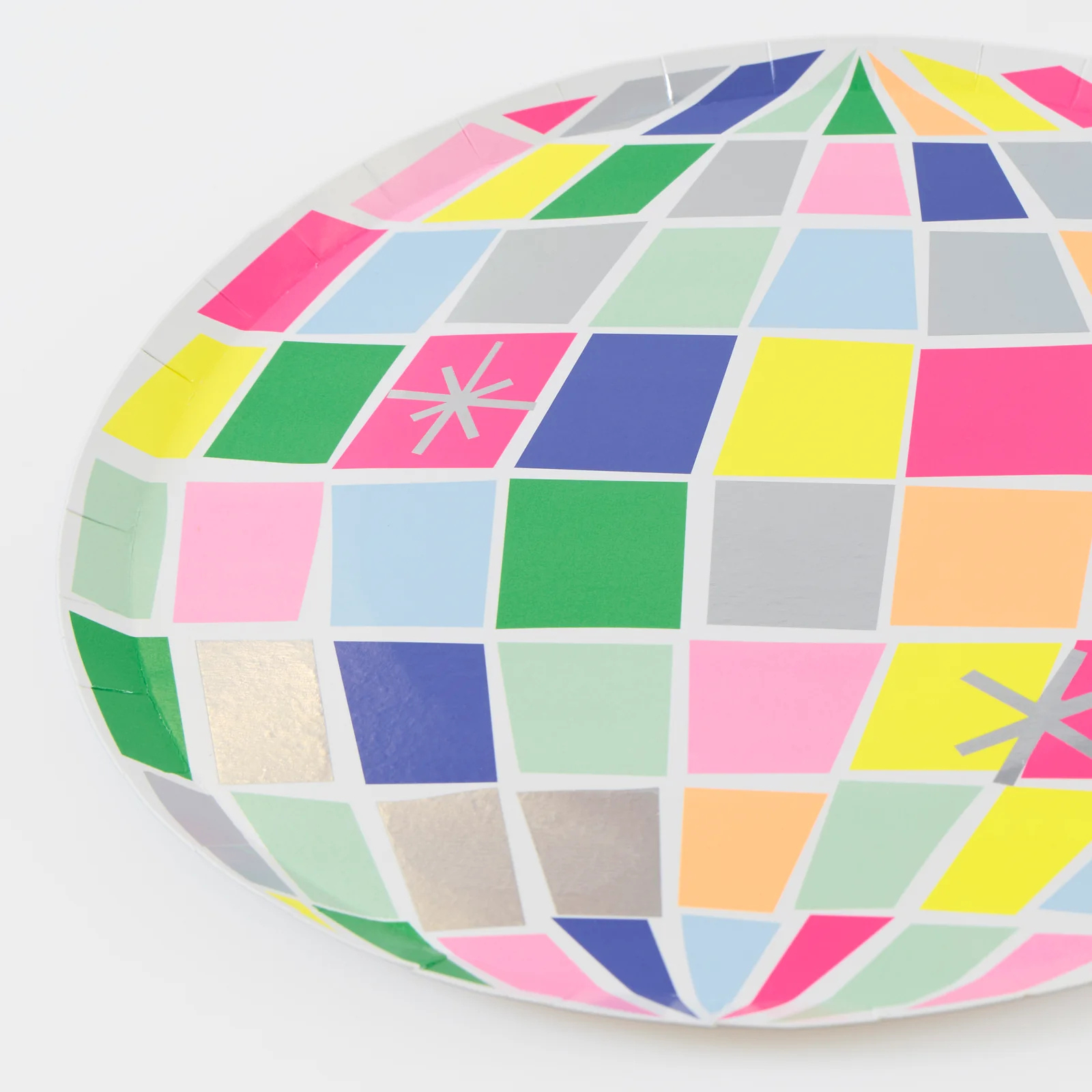 Disco will never die and neither will your party style. These shimmering plates make a striking statement, with playful pops of neon and shiny silver holographic foil that will dance in the light. With a chic blue reverse, they're eye-catching from every angle. Perfect for any celebration that calls for a little extra shine and a lot of fun.