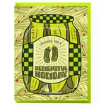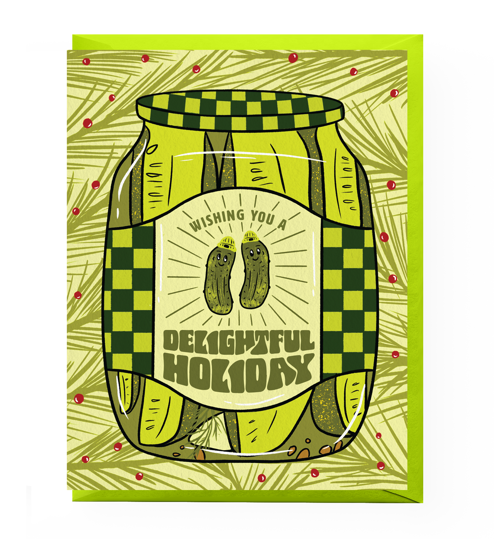 • Card reads: "Wishing You A Delightful Holiday" and features an illustrated checkerboard pickle jar.
