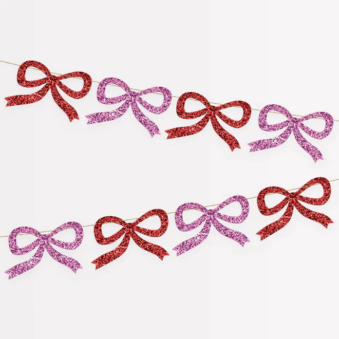 Bows are back in a big way! This elegant garland is guaranteed to add a statement look to any festive celebration. Hang it on your party table, porch, doorway or wall – wherever you want a gorgeous red and pink glitter effect.